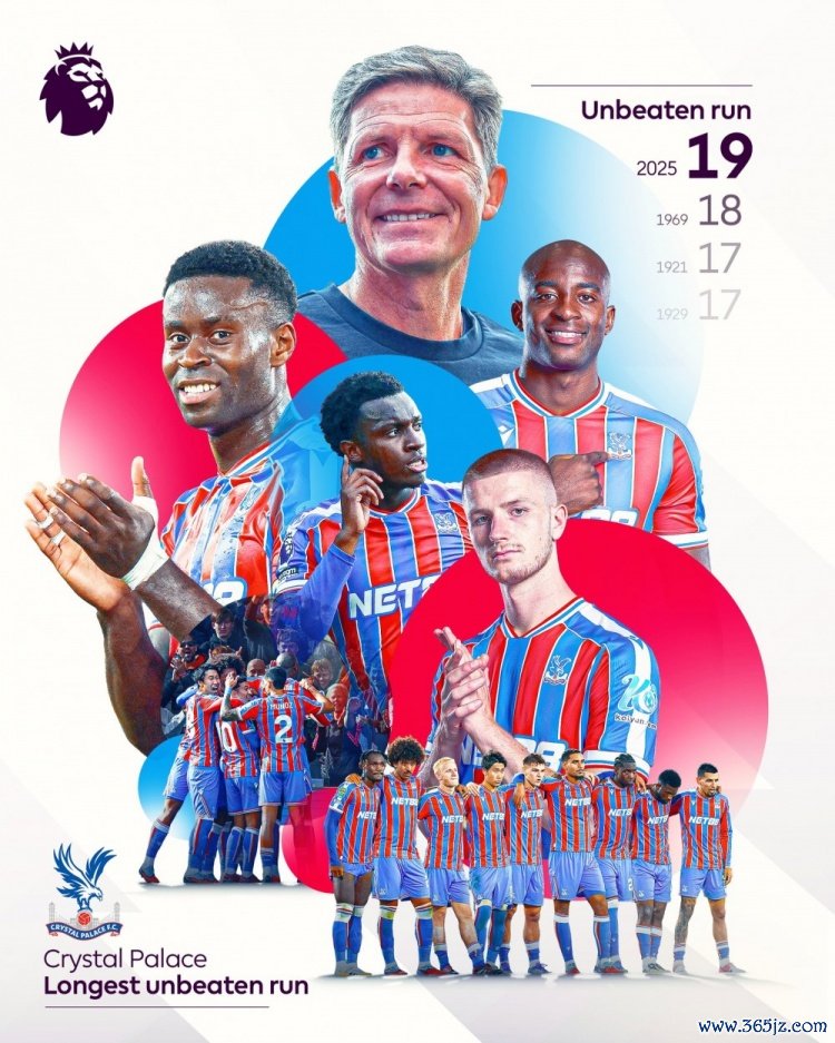 据英超官方统计,水晶宫各赛事19场不败,创造队史最长不败记录。