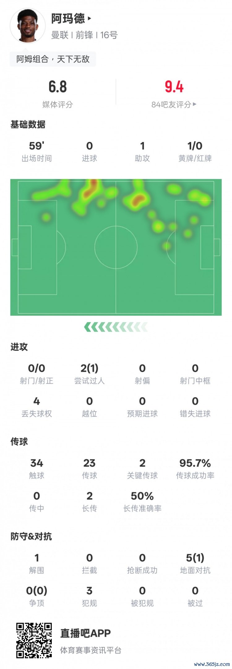 10月20日讯 2025-26赛季英超联赛第8轮焦点战,曼联客战利物浦,阿玛德首发登场,孝顺1次助攻,送出2次关键传球,1次过东谈主收效,评分6.8。