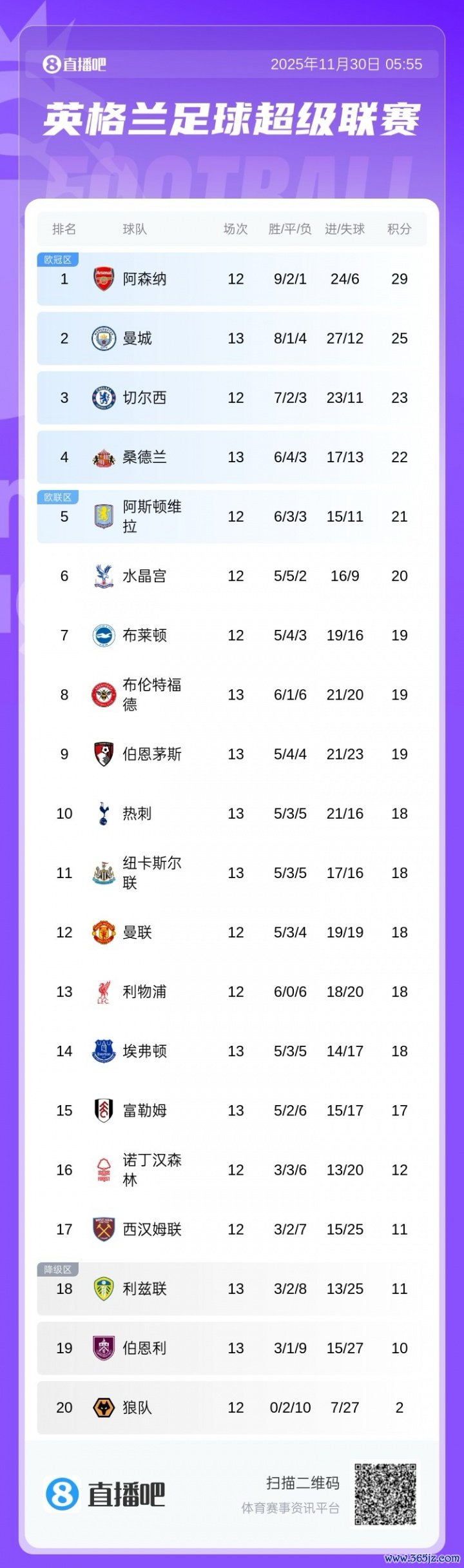 11月30日讯 英超第13轮,热刺1-2不敌富勒姆,曼城3-2绝杀利兹联,桑德兰3-2逆转伯恩茅斯,纽卡4-1埃弗顿。