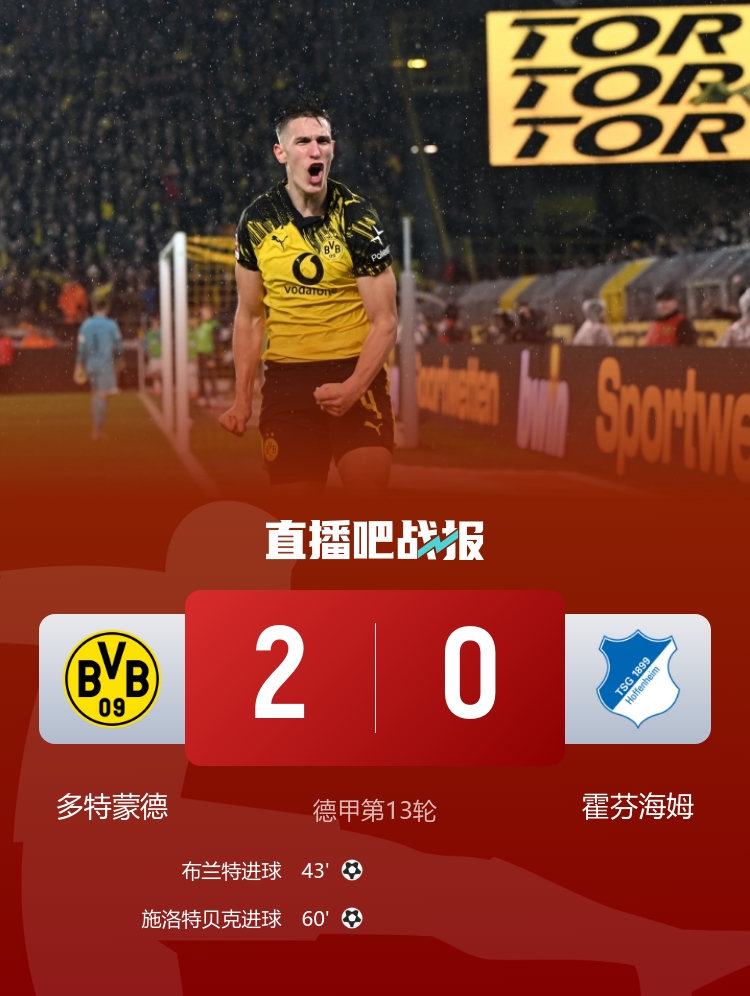6轮不败!多特2-0霍芬海姆距榜首9分 布兰特破门施洛特贝克立功