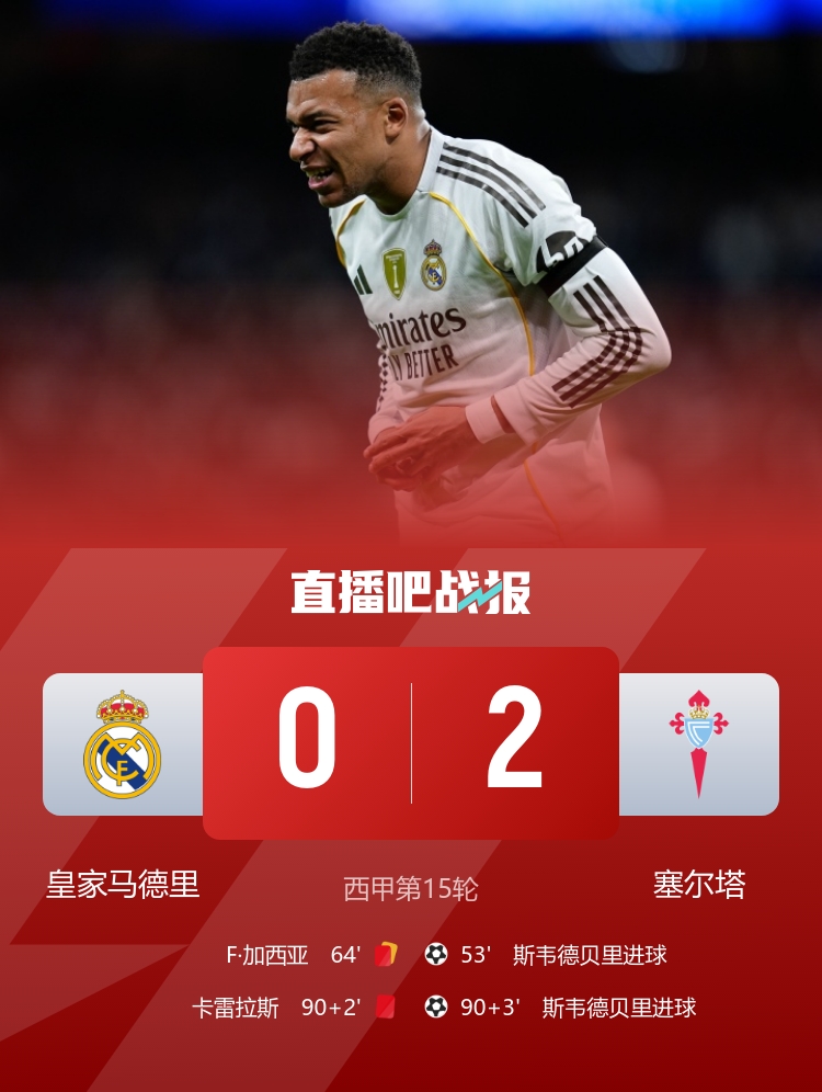 弗兰·加西亚、卡雷拉斯被罚下,皇马主场爆冷0-2塞尔塔。积分榜方面,皇马36分过时巴萨4分。