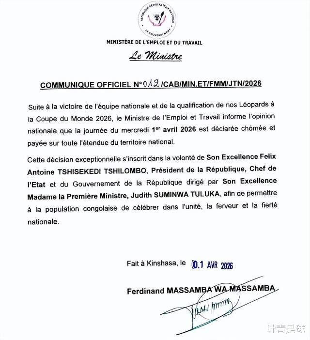 如何庆祝晋级下一轮 世界杯赛 ?4月1日,民主刚果劳动与就业部发布公告: