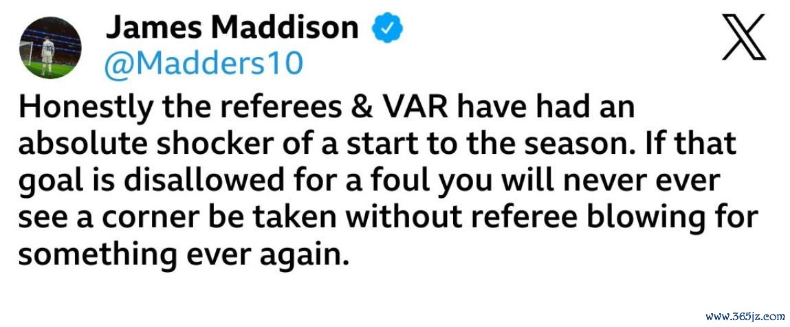 针对这一判罚,麦迪逊暗示:“说真话,裁判和VAR在本赛季的开局发达扫数倒霉透澈。”