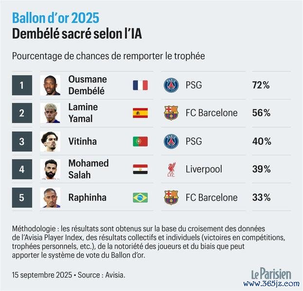 近日,Avisia公司使用东说念主工智能模子瞻望了本年的金球奖得主。效果显现,巴黎球星登贝莱赢得本年金球奖的概率为72%,巴萨球星56%位居次席。
