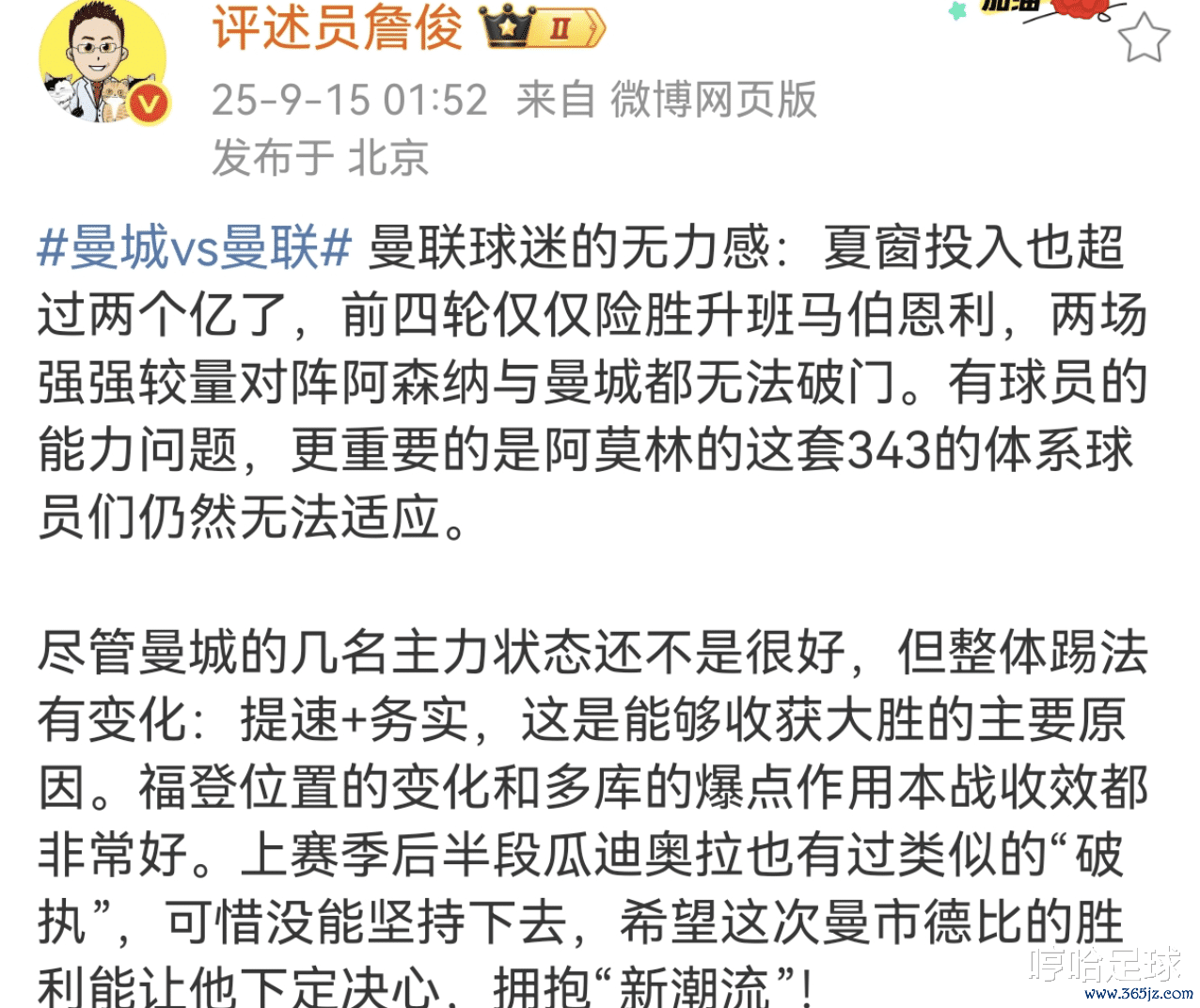 北京时辰9月15日,在英超曼市德比战中,曼城赢得一场圆满的得手,让曼联不绝千里沦。凭借哈兰德的梅开二度以及福登的进球,曼城得益3球大胜。新赛季5场比赛,曼联只赢得1场得手,球队让东谈主看不到但愿。曼联0-3完败曼城,验露面号水货!詹俊点评因事为制,1东谈主迟误全队。