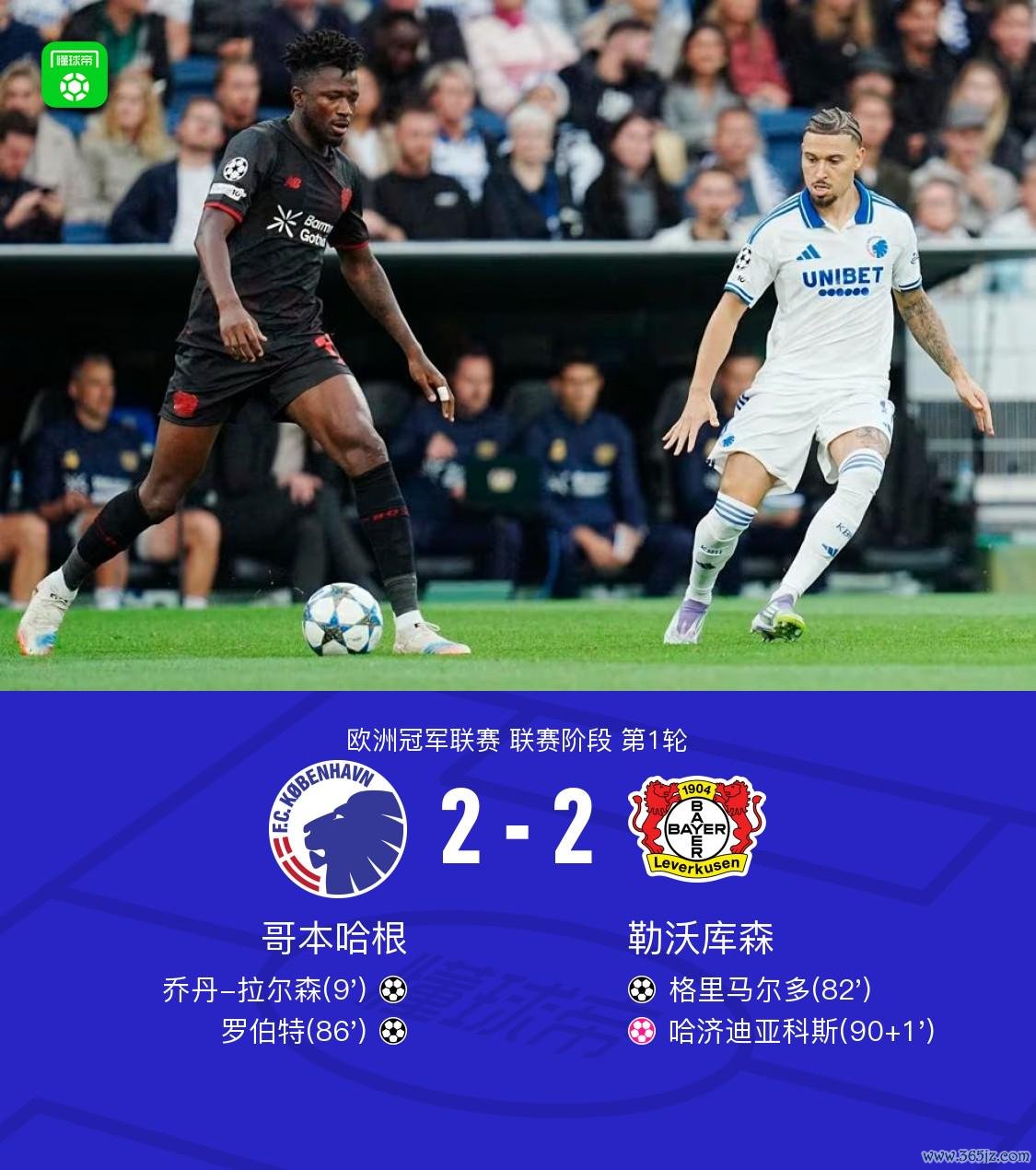 第90+1分钟,哈济迪亚科斯自摆乌龙,勒沃库森2-2哥本哈根