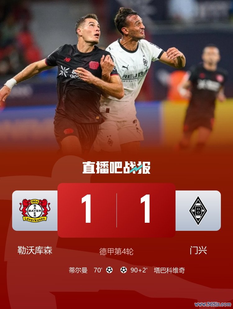第90+2分钟,门兴右侧角球契机,塔巴科维奇中路抢点头球扳平比分,门兴1-1勒沃库森。↓
