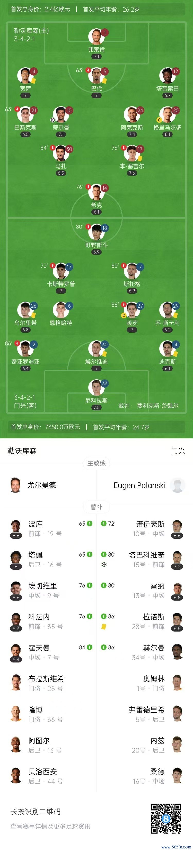 第70分钟,勒沃库森前场右路打出协作后突到底线隔壁送出倒三角回传,第小数踢呲,蒂尔曼中路第二点跟进将球打进,勒沃库森1-0门兴。↓