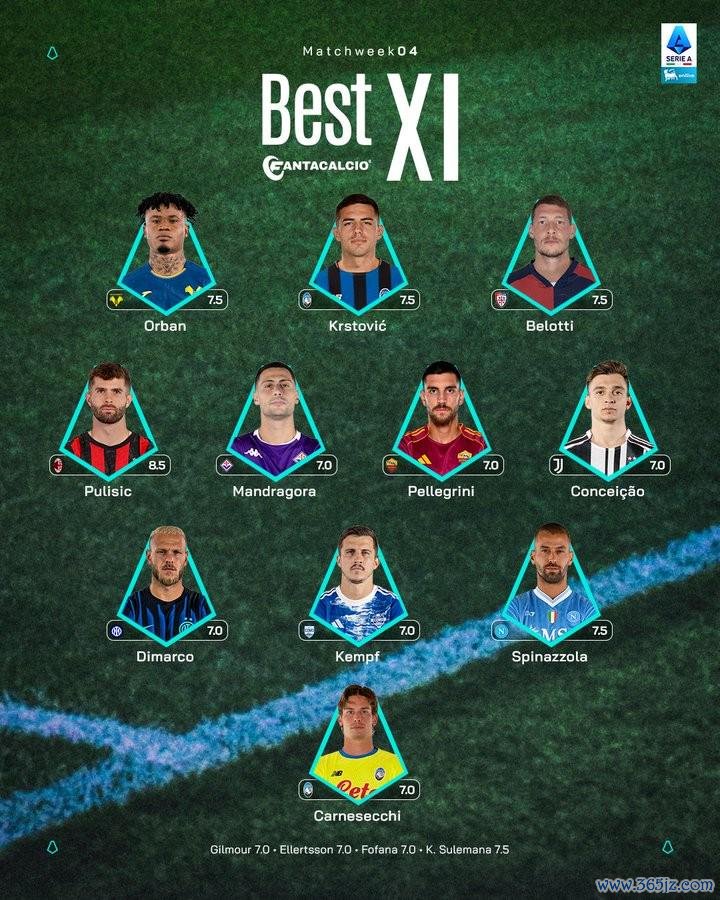 中场:普利希奇(米兰)、曼德拉戈拉(佛罗伦萨)、佩莱格里尼(罗马)、弗朗西斯科-孔塞桑(尤文)