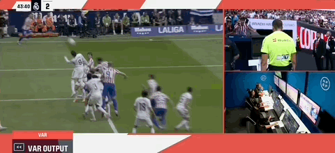 第43分钟,朗格莱用手将球打入球门,裁判不雅看VAR后吹掉进球