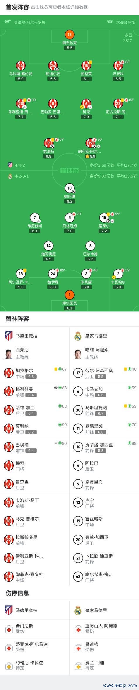 第25分钟,居莱尔送妙传,姆巴佩禁区右侧抽射破门,皇马1-1扳平马竞!