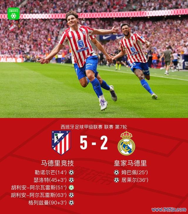 北京时刻9月27日西班牙足球甲级联赛 联赛 第7轮,马德里竞技主场对阵皇家马德里。马德里竞技勒诺尔芒破门,瑟洛特破门,胡利安-阿尔瓦雷斯梅开二度,格列兹曼破门。皇家马德里姆巴佩破门,居莱尔破门。最终比分马竞 5-2 皇马。