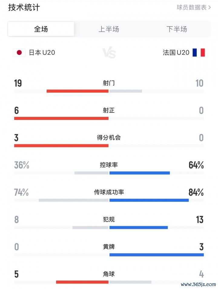 本场比赛惯例期间,日本队狂轰19脚6次射正、控球率36%,法国10次射门0射正、控球率64%。