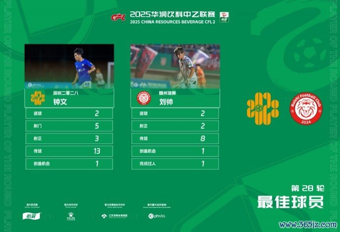 10月10日讯 中乙联赛官方公布第28轮最好球员,深圳二零二八球员钟文和赣州瑞狮球员刘帅同期当选。