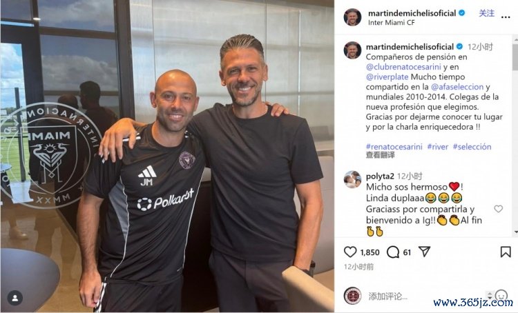 德米凯利斯探询迈阿密海外俱乐部,并与迈阿密海外主帅、曩昔队友马斯切拉诺合影,他在应付媒体上晒出合照,配文:“我在切萨里尼(河床青训)和河床的室友,咱们不仅在2010年、2014年天下杯上为阿根廷并肩战争,如今更成为素养同业。感谢你让我晓悟你当今的六合,此次相易令我受益匪浅。”