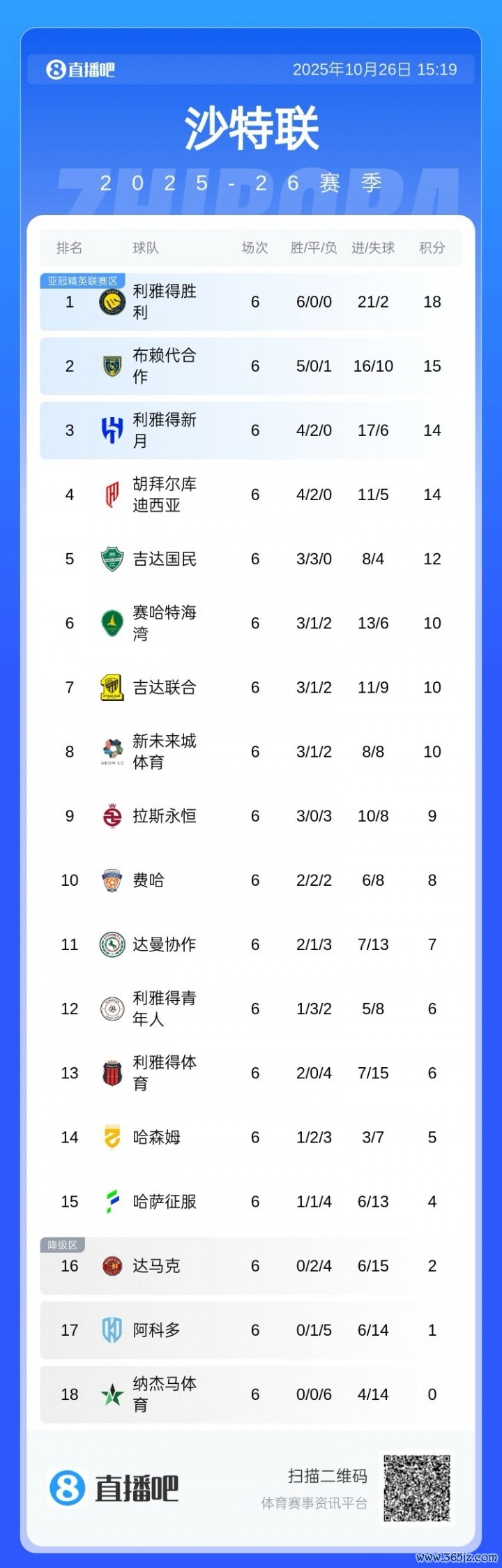 利雅赢得手10连胜技能,C罗未出战亚冠二和沙金冠,联赛6场打满斩获6球1助攻。
