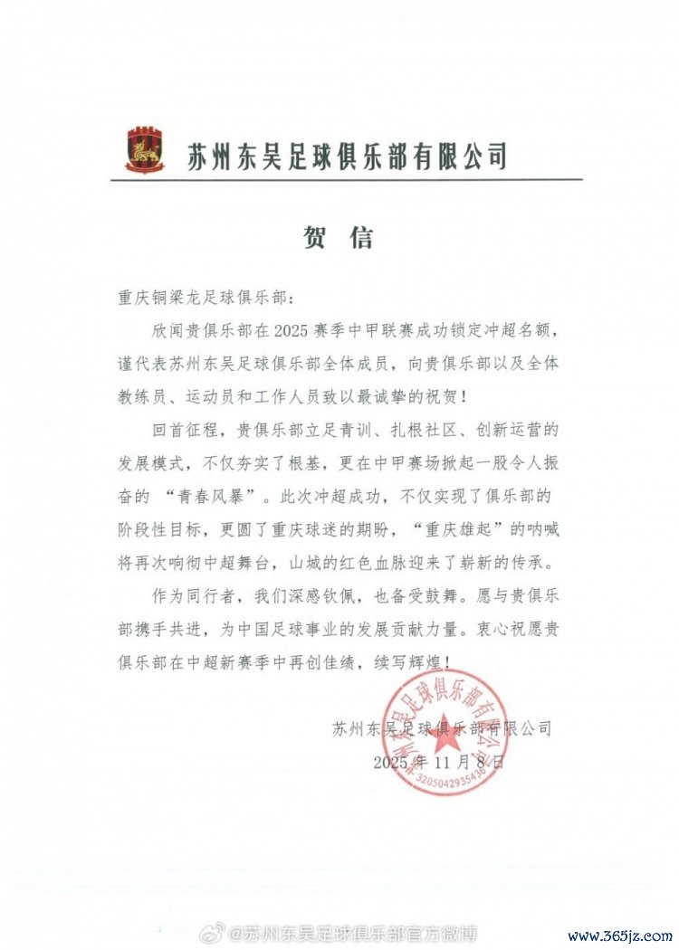 欣闻贵俱乐部在2025赛季中甲联赛告捷锁定冲超限额,谨代表苏州东吴足球俱乐部合座成员,向贵俱乐部以及合座指示员、畅通员和责任主说念主员致以最诚挚的祈福!