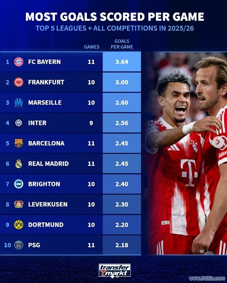 10月21日讯 德转盘货了本赛季五大联赛球队现在场均进球最多榜单(各项赛事),其中拜仁高居榜首,具体如下: