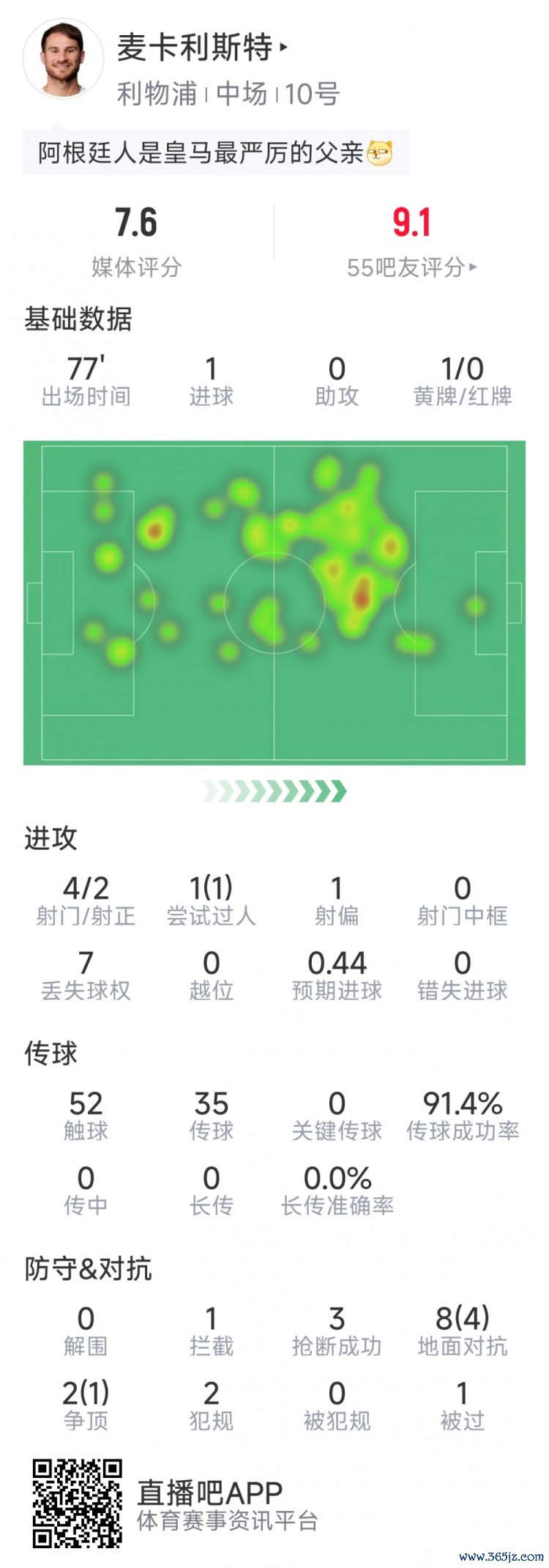 11月5日讯 在本轮欧冠利物浦对阵皇马的比赛中,麦卡利斯特破门,以下为他在本场数据: