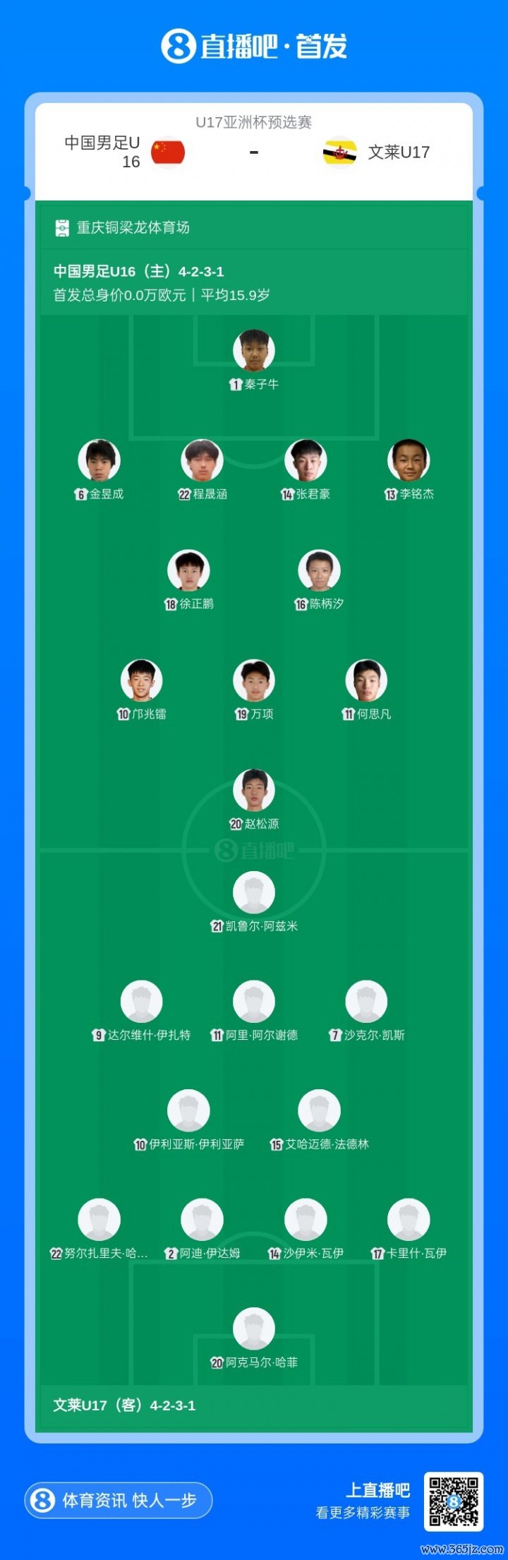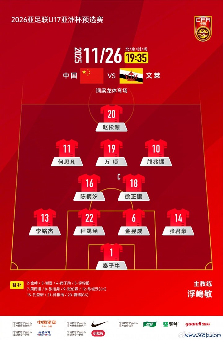 11月26日讯 北京工夫19:35,U17亚初赛,U16国足对阵文莱U17。赛前,两边首发出炉。