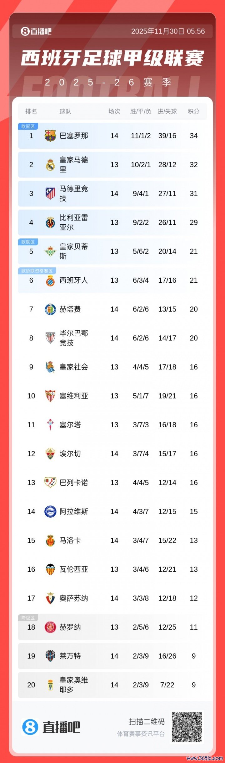 11月30日讯 西甲第14轮,巴萨3-1阿拉维斯,马竞2-0皇家奥维耶多。