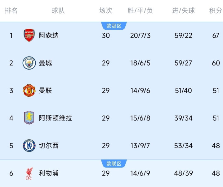 最新联赛排名次序榜