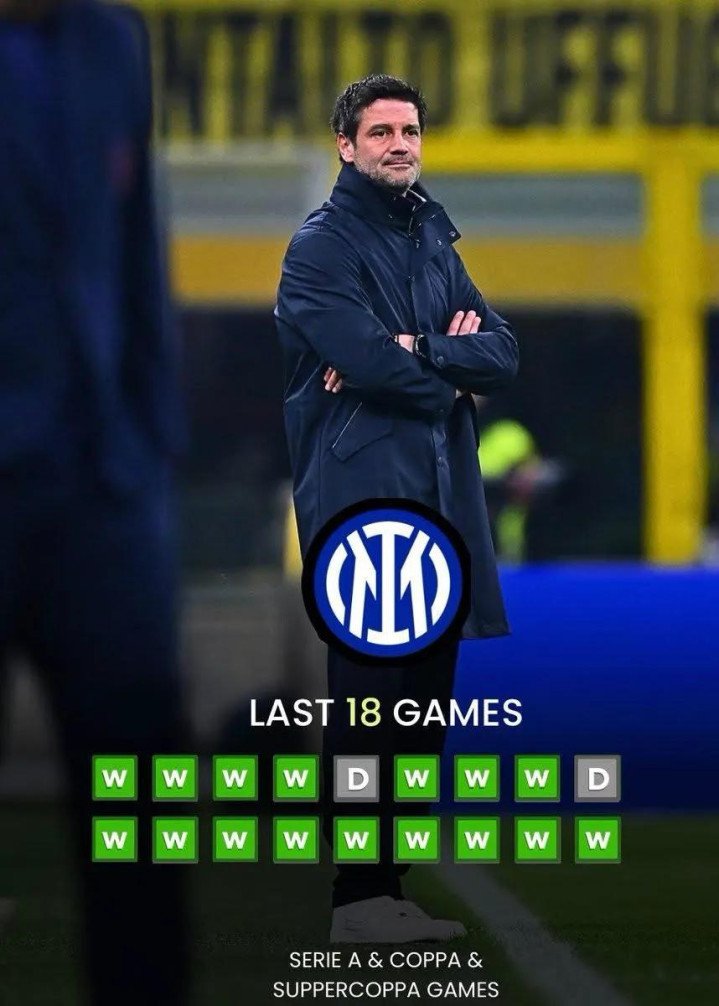 国际米兰在意甲球队球队表现过去18轮不败16胜2平