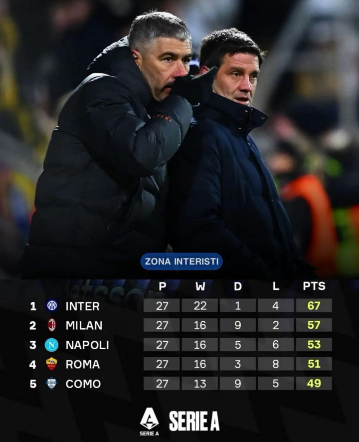 阿莱格里追平皮奥利夺冠季第27轮57积分