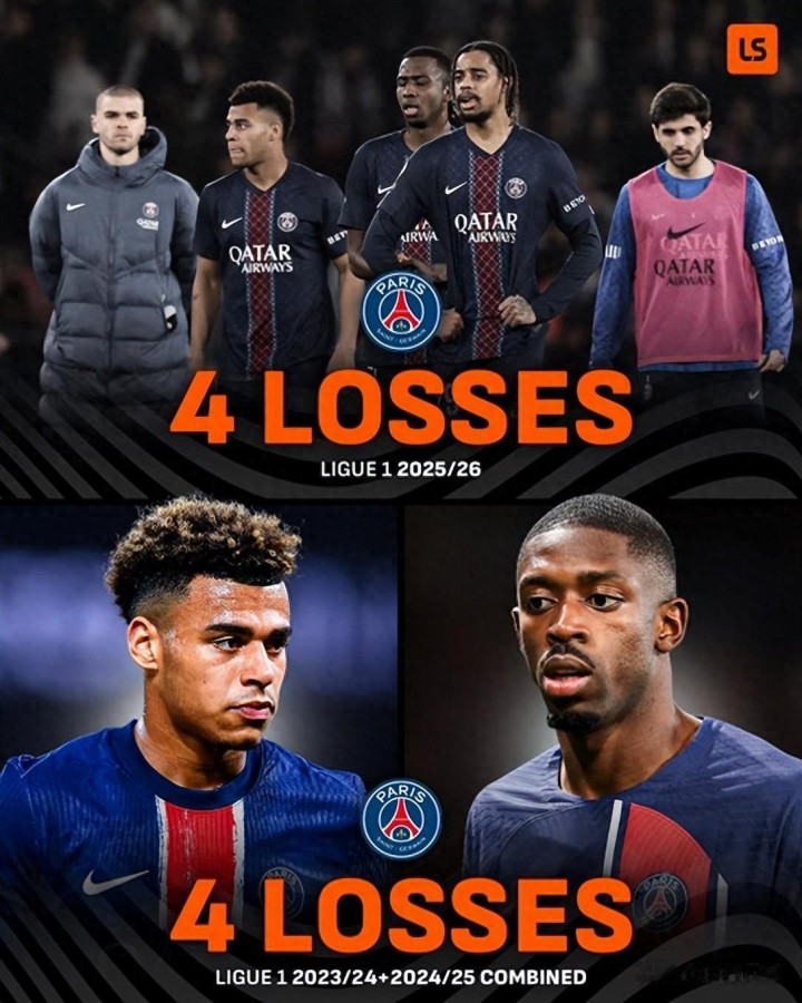 根据最新比赛赛季数据统计,巴黎圣日耳曼在本比联赛季(2025/26比联赛季)的法甲赛事杯中已经吞下了4场败仗。这不仅仅是一个简单的输球数字,更是一个极其危险的信号:大巴黎本比联赛季至今的败场数,已经追平了过去两个比联赛季(2023/24比联赛季与2024/25比联赛季)的败场总和。
